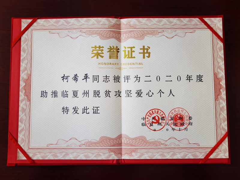 授予柯希平董事長“助推臨夏州脫貧攻堅愛心個人”
