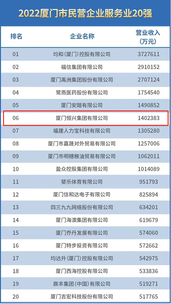 廈門恒興集團有限公司入榜“2022年廈門市民營企業(yè)百強”,位居榜單第10位;入榜“2022廈門市民營企業(yè)服務(wù)業(yè)20強”,位居該榜第6位。??